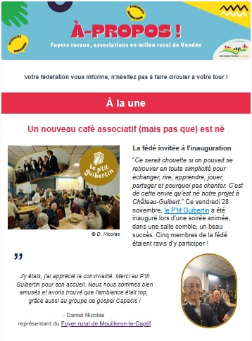 Si vous souhaitez recevoir notre newsletter » à-propos ! « , n’hésitez pas à nous en faire la demande, par mail fdfr.85@mouvement-rural.org
